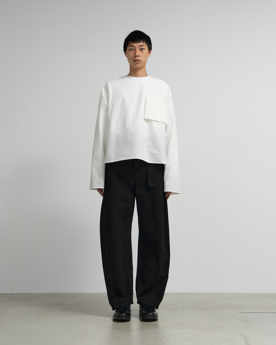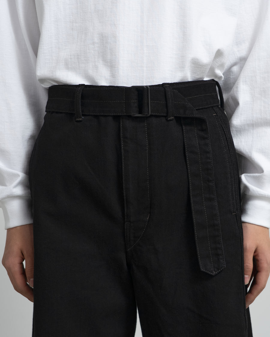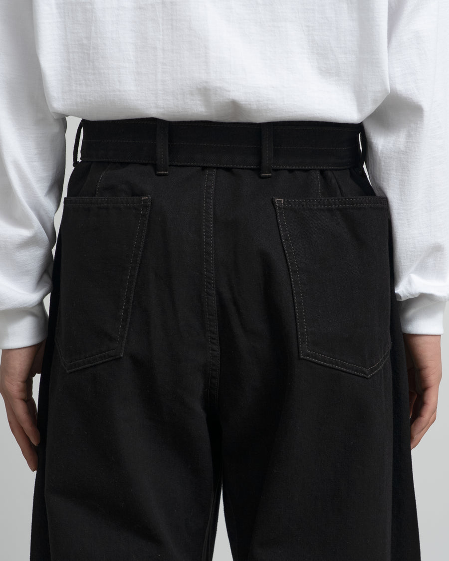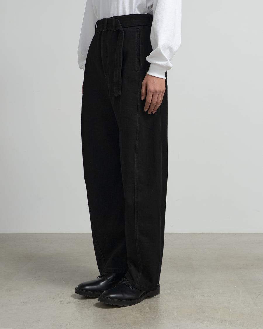 サイドシームがねじれるようにフロントへと斜行するブランド定番のベルテッドパンツ。サイドにシームポケット、バックにはパッチポケット。ベルトは取り外し可能。生地と対照的なブラウンのステッチがアクセントに。共地のBOXY JACKETとセットアップでの着用もおすすめ。