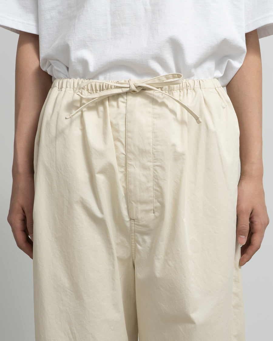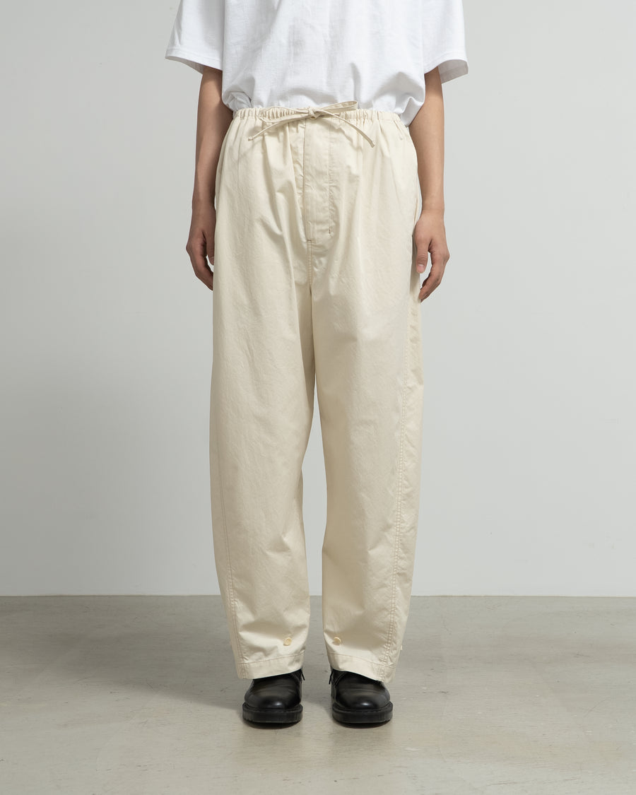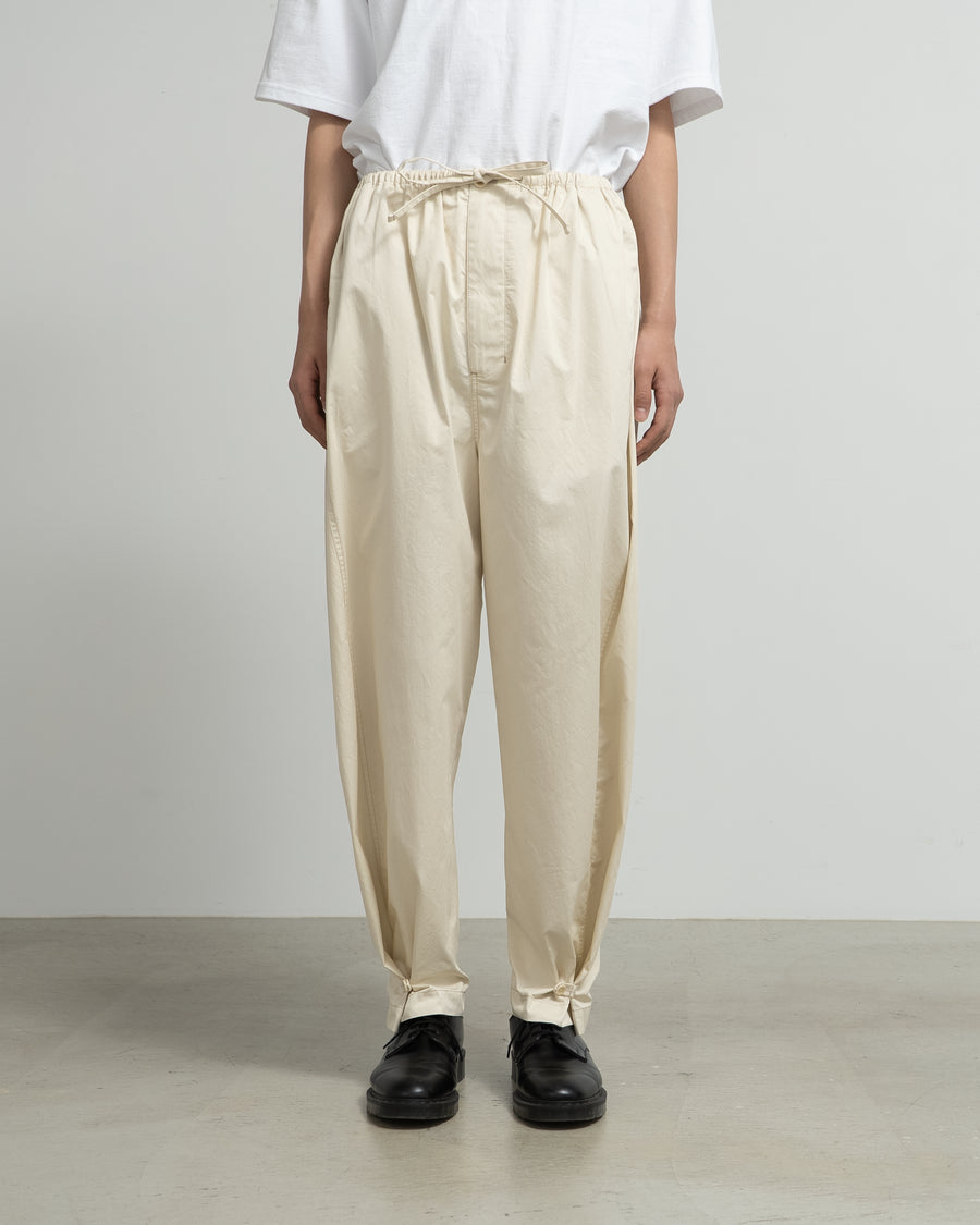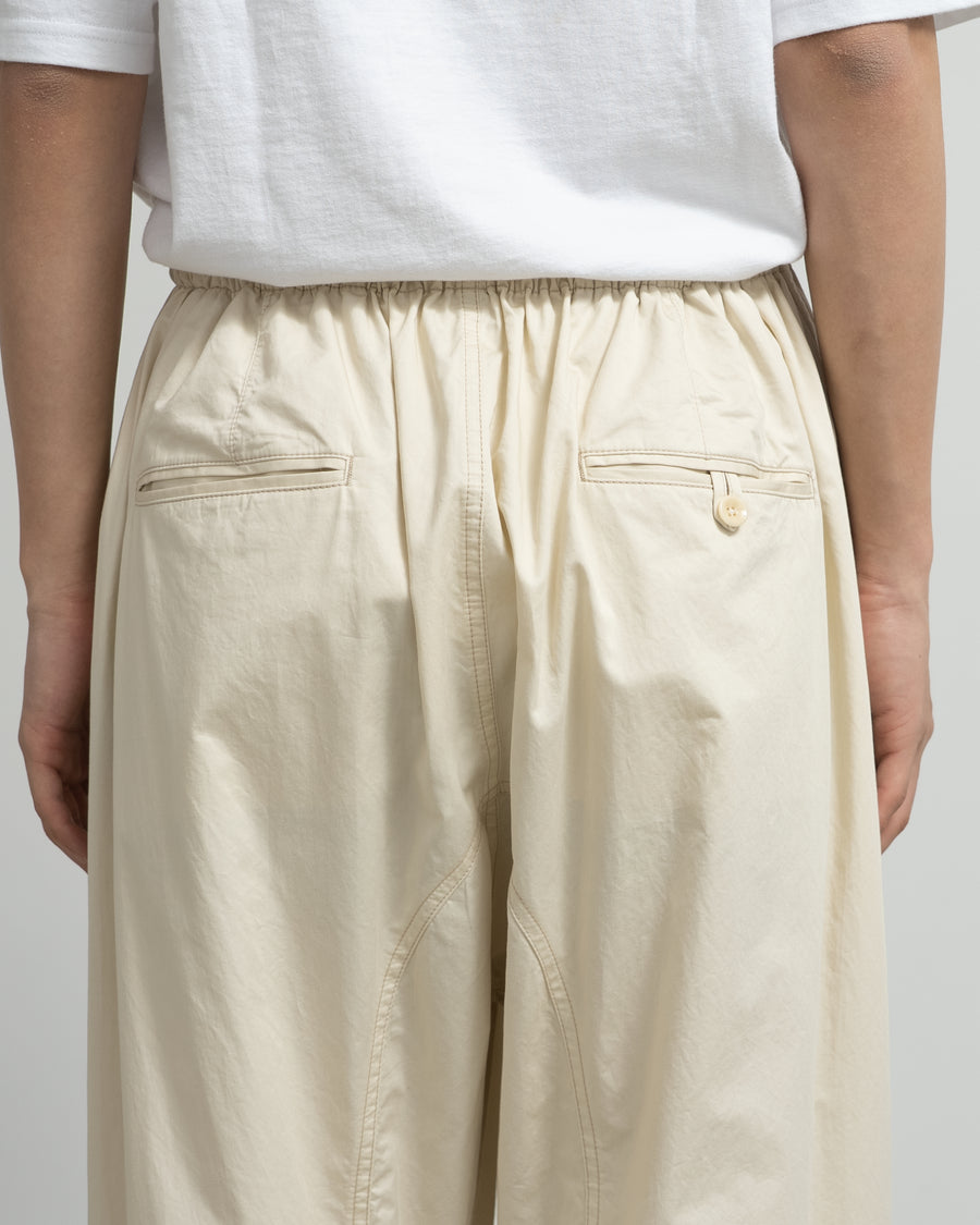 柔らかな肌触りと控えめな光沢感が特徴のコットンサテンを使用したオーバーパンツ。前面に施された独特なツイストにより、モダンなシルエットと個性的なスタイルを両立。裾周りに施されたボタンでシルエットの変化を楽める一本。